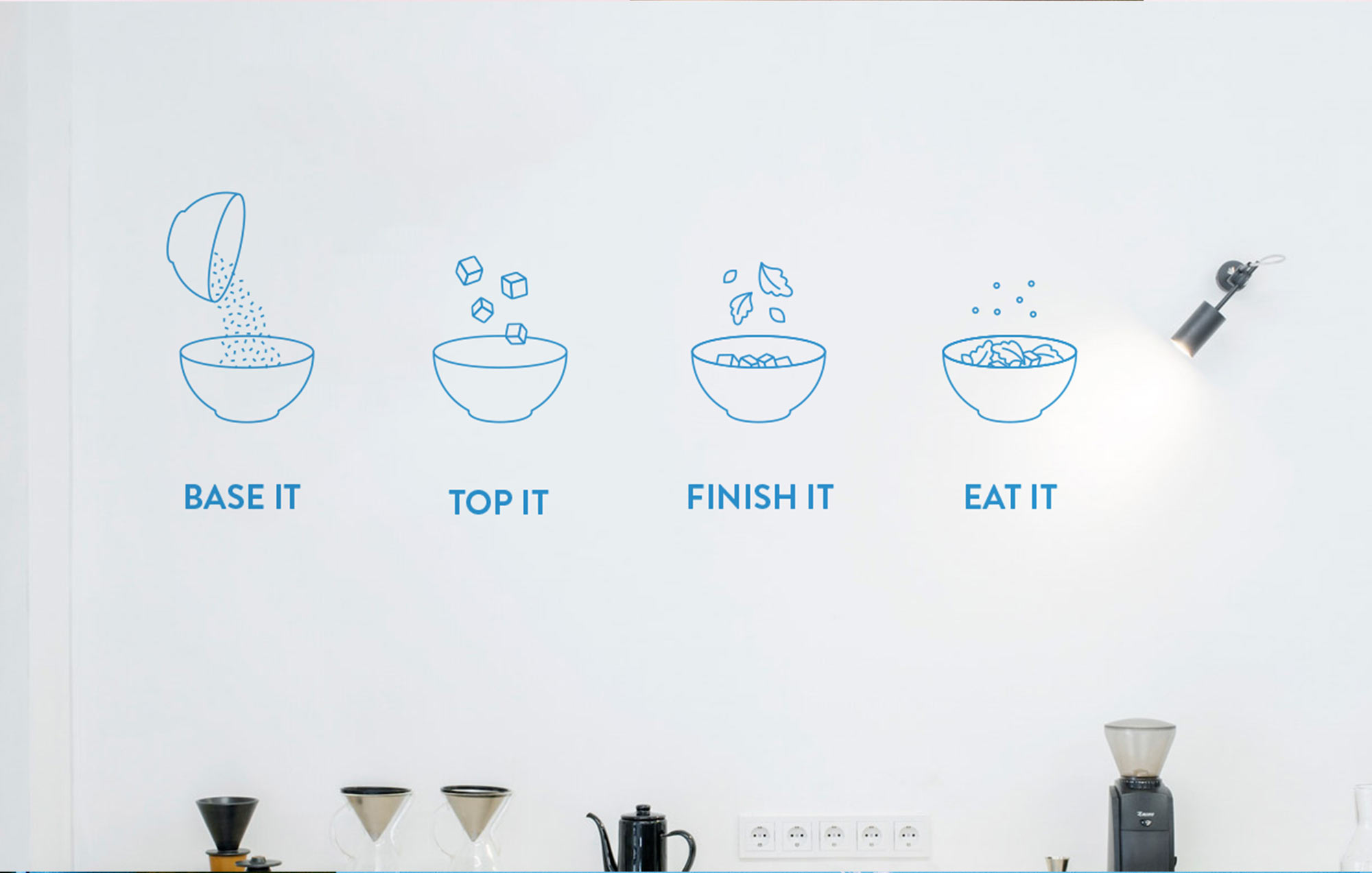 For instructive information, the textural screen prints were contrasted with a clean and minimal icon style. These icons were used on the menu and on the wall to explain dish types and order process.